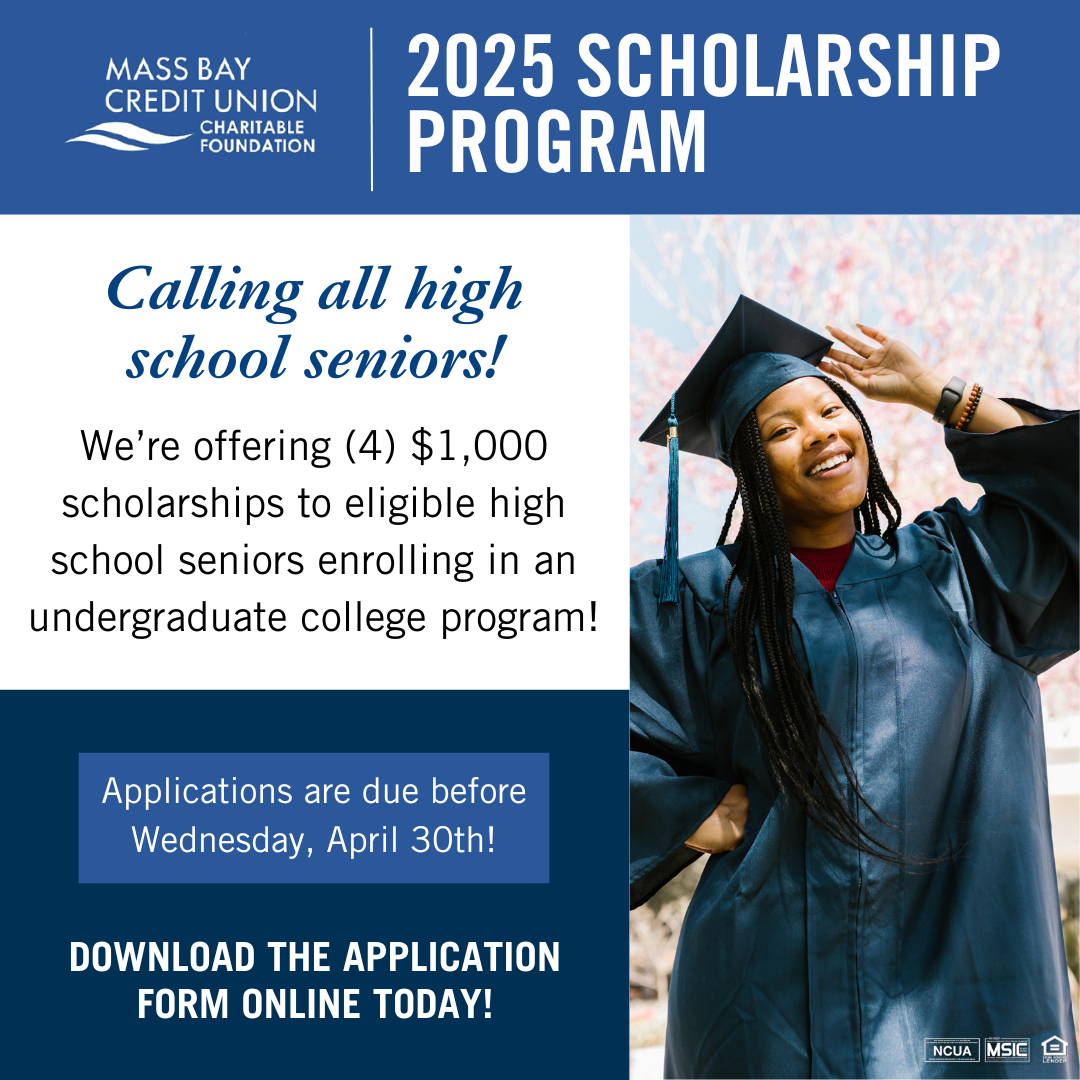 We’re excited to share that the Mass Bay Credit Union Charitable Foundation is giving away four $1,000 scholarships to high school seniors heading to college next year.