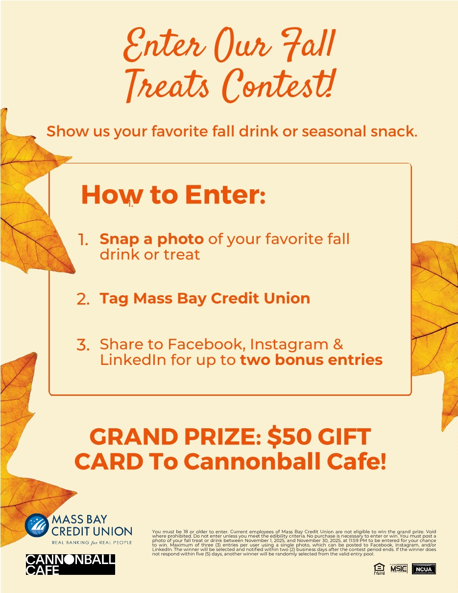 Our Fall Treats Contest is brewing up some fun! ☕ Snap a photo of your favorite fall drink or treat and tag Mass Bay Credit Union. Show off your favorite fall flavors and you could win a $50 gift card to Cannonball Cafe!